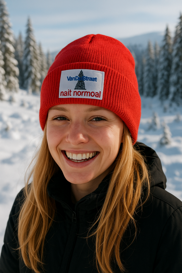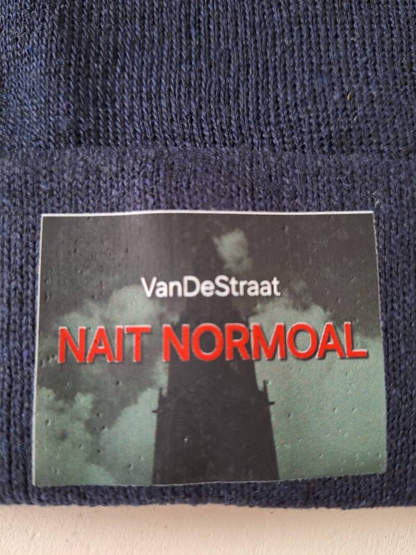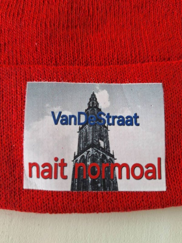 Wintermuts van VanDeStraat met daarop de Martinitoren en de tekst 'Nait normoal'. Voor zowel mannen als vrouwen, prima pasvorm. Met een opgevouwen rand, perfect voor buitenactiviteiten zoals bijvoorbeeld Winterwelvaart in Groningen.